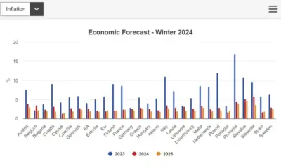 Според предварителните данни на статистическата служба на ЕС, Евростат инфлацията през януари 2024 г. е 3,1% - спад спрямо 3,4% през декември 2023г. Година по-рано процентът беше 10,0%. За еврозоната годишният процент на инфлация също се забавя през януари 2024 г., понижавайки се от 2,9% през декември 2023 г. до 2,8%. Година по-рано процентът беше 8,6%.