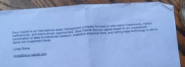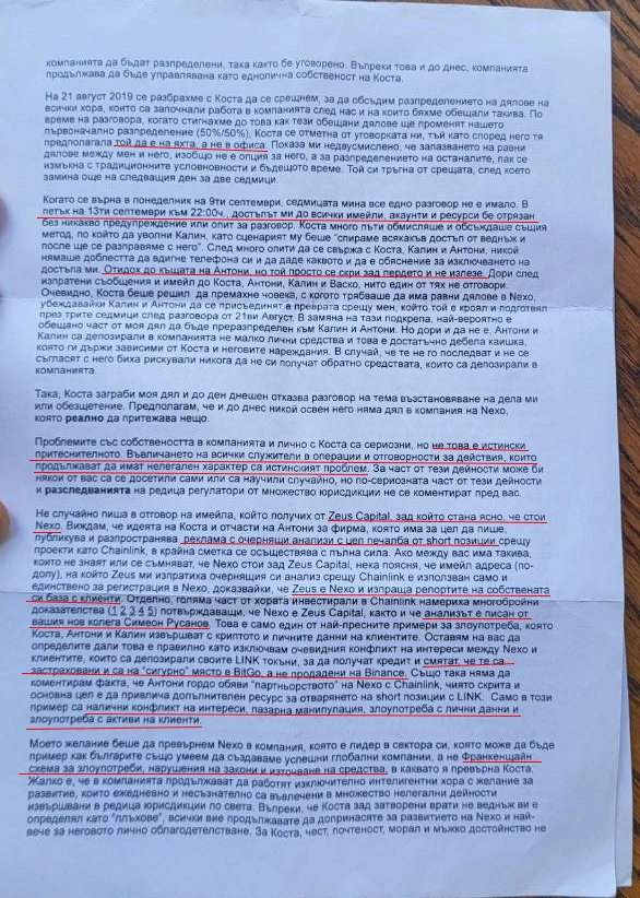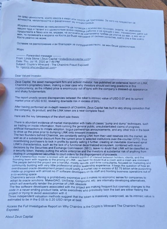 В писмото, за което се твърди, че е писано от Шулев, се говори за ежедневни незаконосъобразни действия, пазарна манипулация, злоупотреба със средства на клиенти, грубо нарушаване на законите на много държави, както и „Франкенщайн схема за злоупотреби и източване на средства“. Конкретно се посочва Zeus Capital, зад която стоял Nexo, чиято функция трябвало да е реклама с очернящи анализи с цел печалба на шорт позиции срещу проекти като Chainlink.