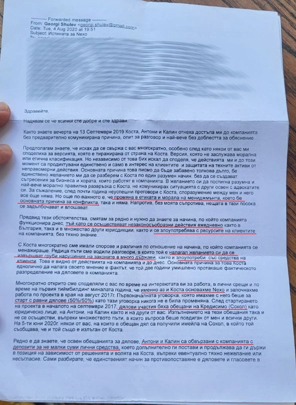 Старо предполагаемо писмо на единия от основателите на Nexo беше публикуванo в международни и български медии. То е от името на Георги Шулев и за него се счита, че е писано през 2020 година, когато Шулев бива отстранен от компанията. Адресати се негови колеги и партньори.