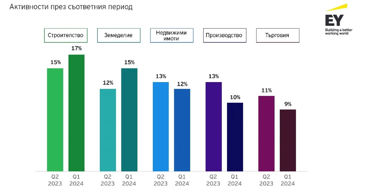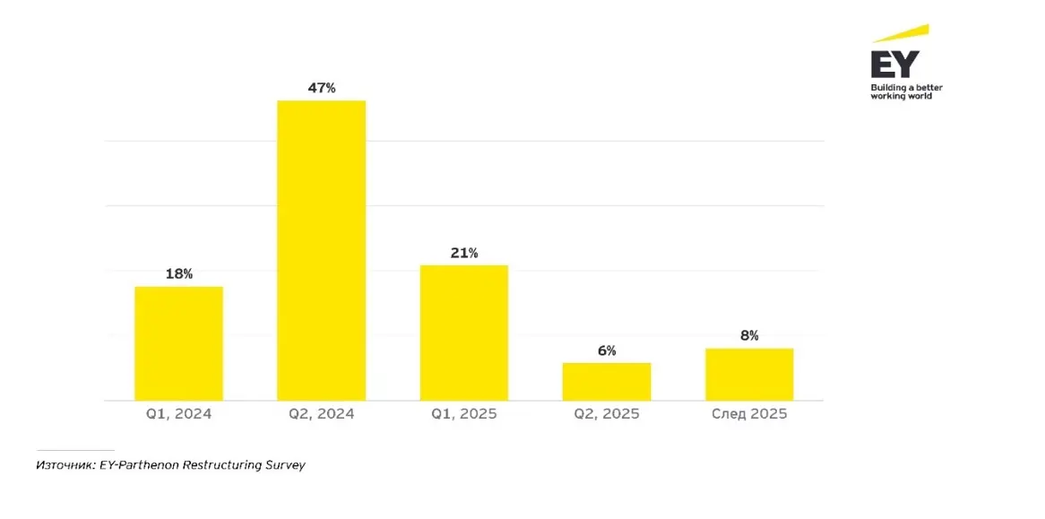 „Първата половина на годината имаше някои значими престктурирания в България. През юли 2024 г., Европейската комисия одобри план за преструктуриране на Български пощи. Това е и първото решение на ЕК за план за пресктуркуриане на пощенски оператори. Бяха разгледани и предложения за преструктуриране на банковите кредити на някои големи производствени предприятия“, коментира данните Мартин Бочев, съдружник, ръководител на отдел „Стратегия и сделки“ в EY Bulgaria.