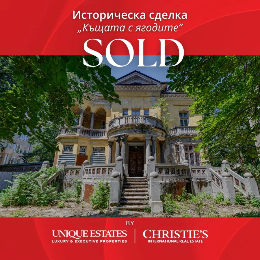 Продажбата на Къщата с ягодите на ул. „Сан Стефано“ 6 в София ще е най-значимата сделка за жилищен имот през 2024 г. у нас, съобщават от ексклузивния посредник Unique Estates/Christie’s International Real Estate. Компанията е получила 6-месечен мандат за реализация на продажбата и успява в срок, като това е и първата сделка на Christie’s International Real Estate в България с официалния ѝ представител у нас е Unique Estates.