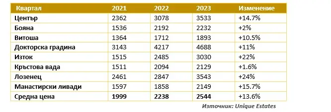 По данни на Unique Estates средната цена на апартамент в София е достигнала малко над 2500 евро/кв. м при около 2200 евро/кв. м година по-рано. Във високия клас жилища цената е около 3500 евро/кв. м, а на емблематичните локации в София сделките се случват на два пъти по-високи цени.