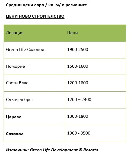 „Макар ваканционните жилища да започват да „догонват” градските имоти, цените им все още са значително по-ниски. В Созопол нивата, на които се реализират сделките за ново строителство в момента, вече са в диапазона 1 900 – 2 200 евро/ кв. м, като са отчетени и сделки на 2 800 евро/кв. м. Цените все още са около 20-30% по-ниски в сравнение с тези на качествен апартамент в София, например”, коментира Екатерина Желяпова, търговски директор на Green Life Development.