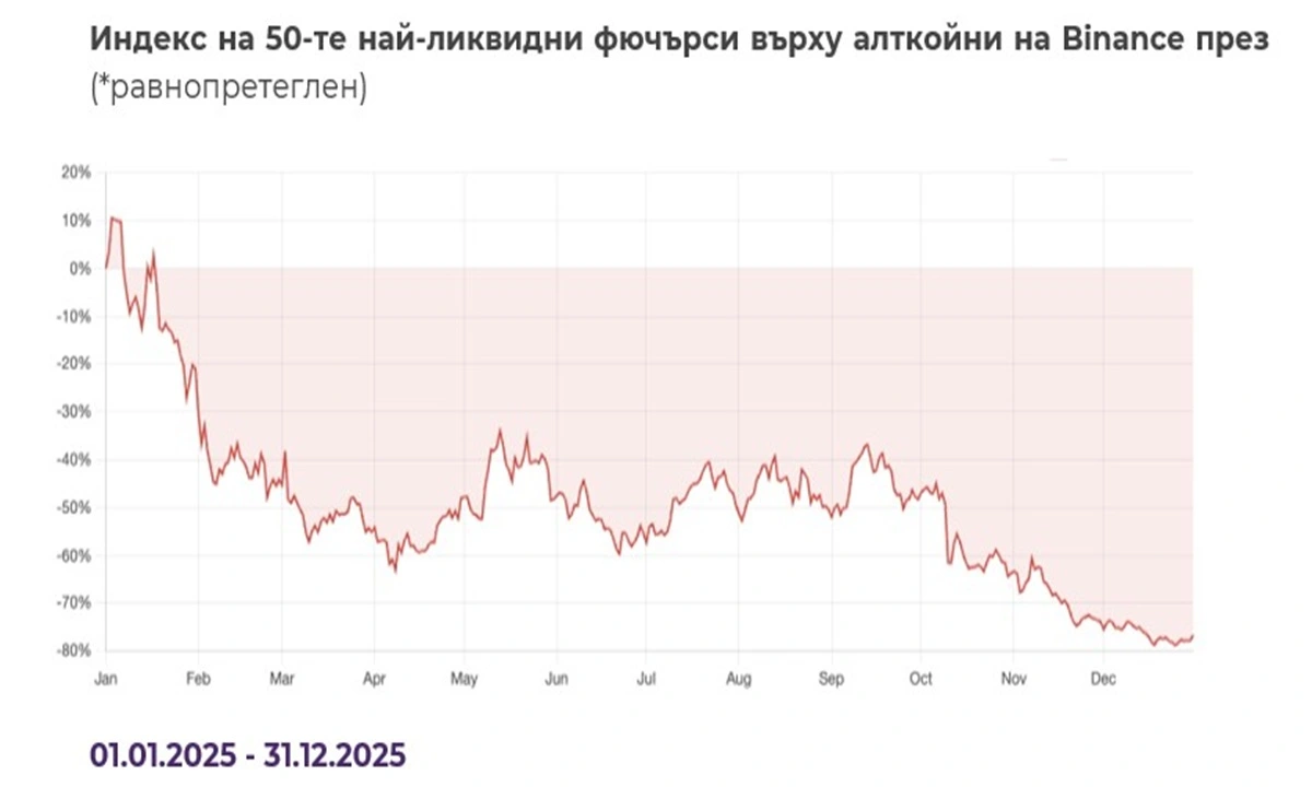 ● Равнопретеглен индекс на 50-те най-ликвидни криптовалути – около -80%