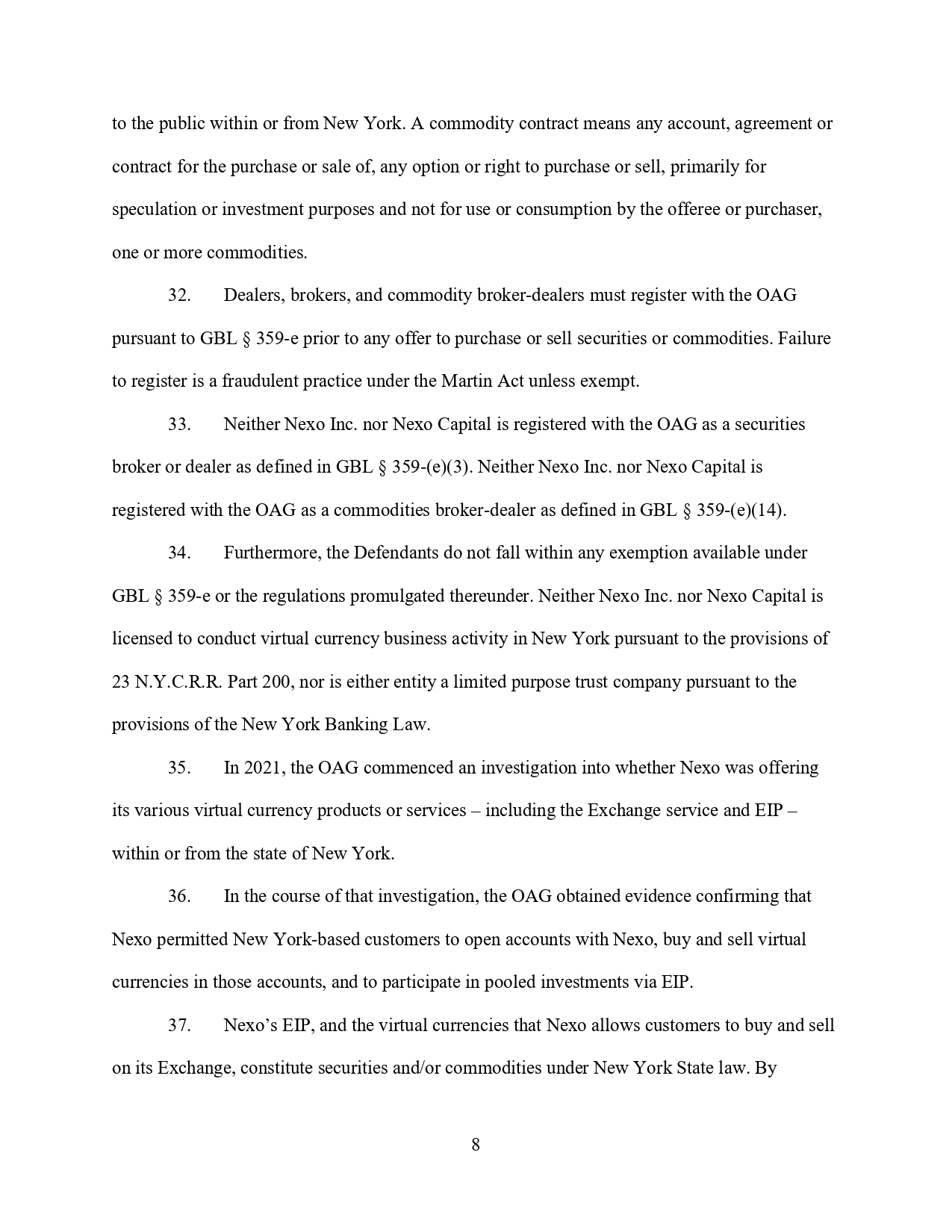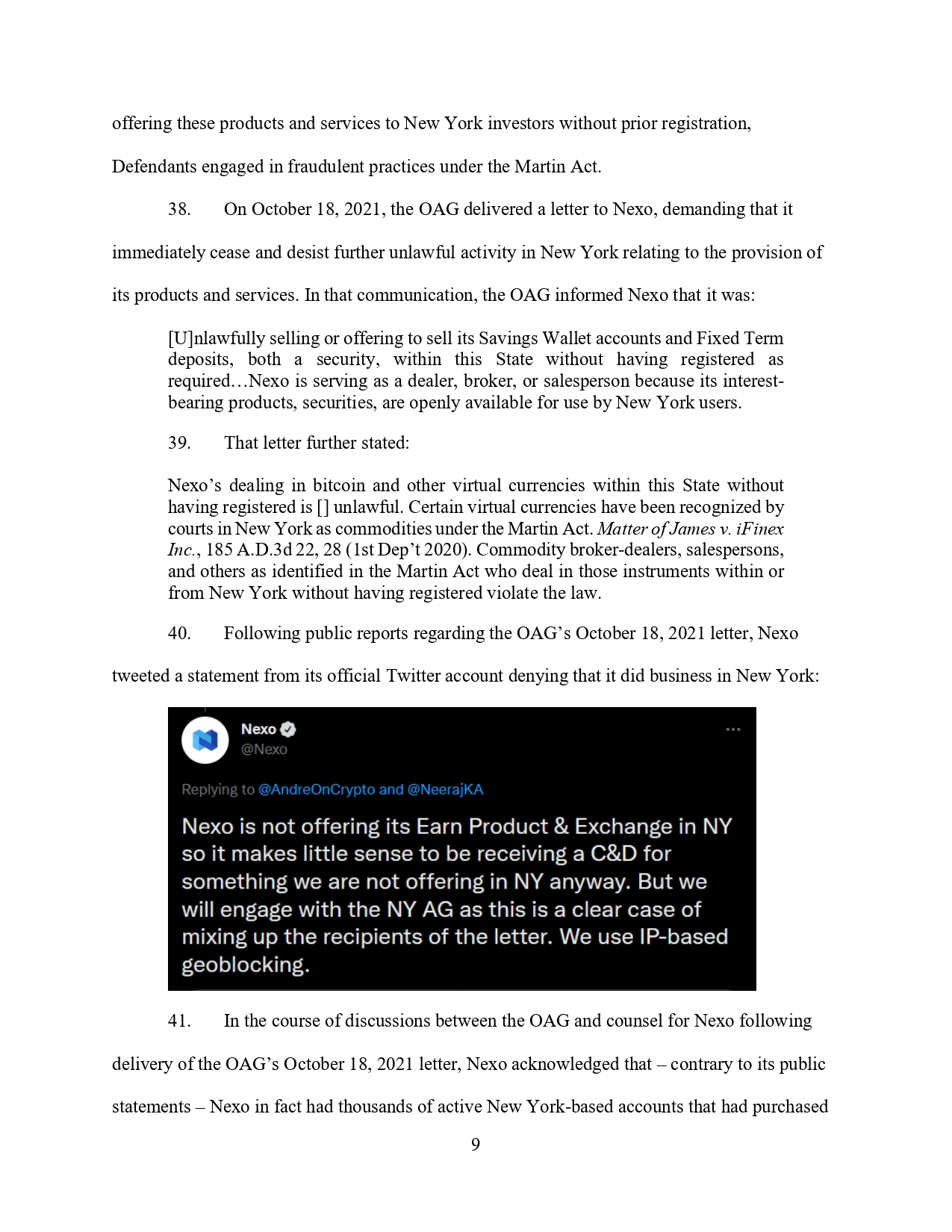 На 18 октомври 2021 г. OAG изпраща писмо до Nexo, в което изисква от него незабавно да преустанови по-нататъшната си незаконна дейност в Ню Йорк, свързана с предоставянето на неговите продукти и услуги. 39. В това писмо се посочва още, че търговията на Nexo с биткойн и други виртуални валути на територията на този щат, без да е регистрирана, е незаконна.