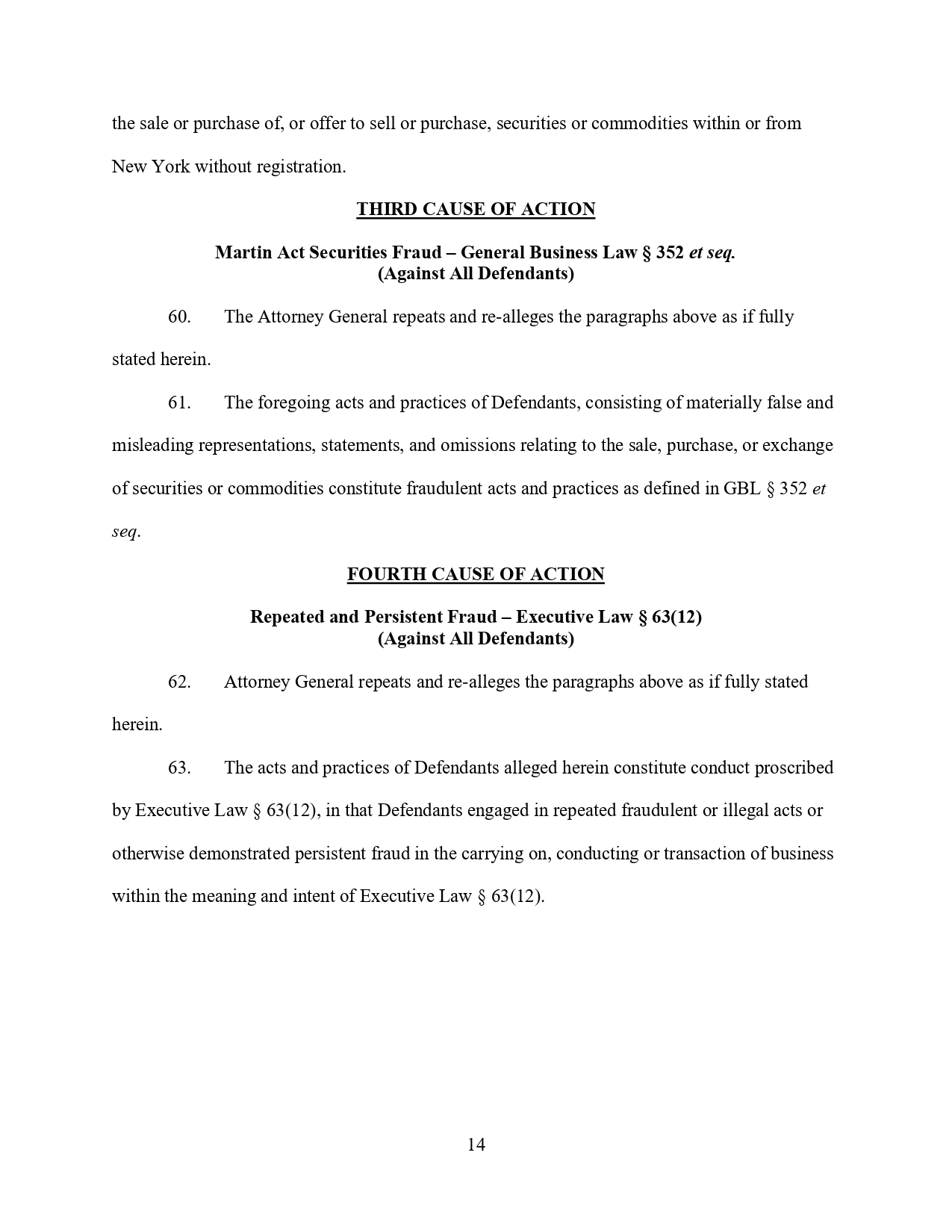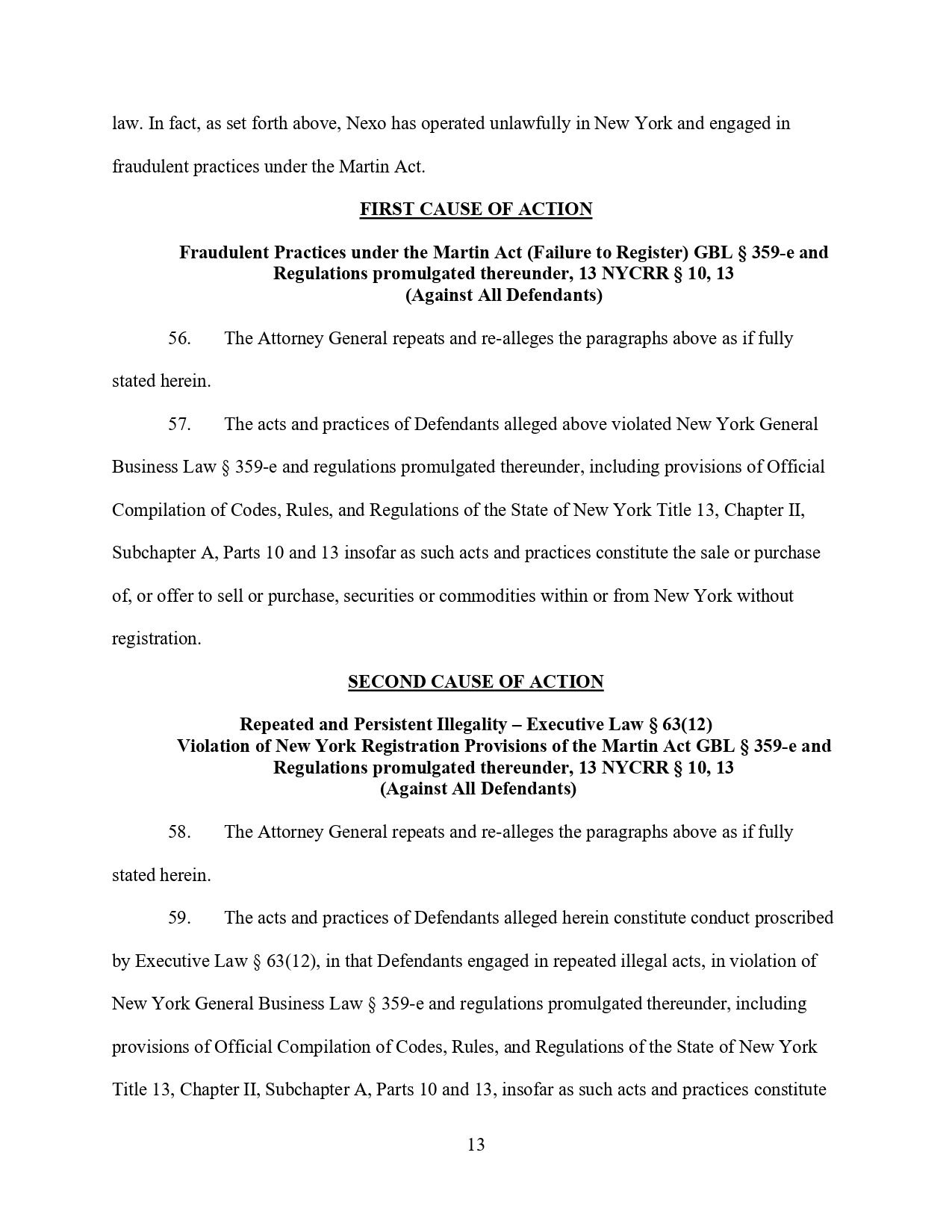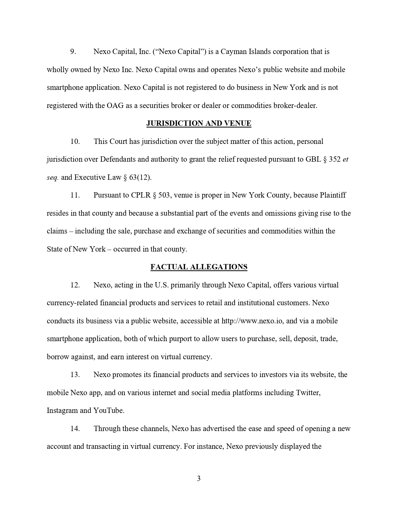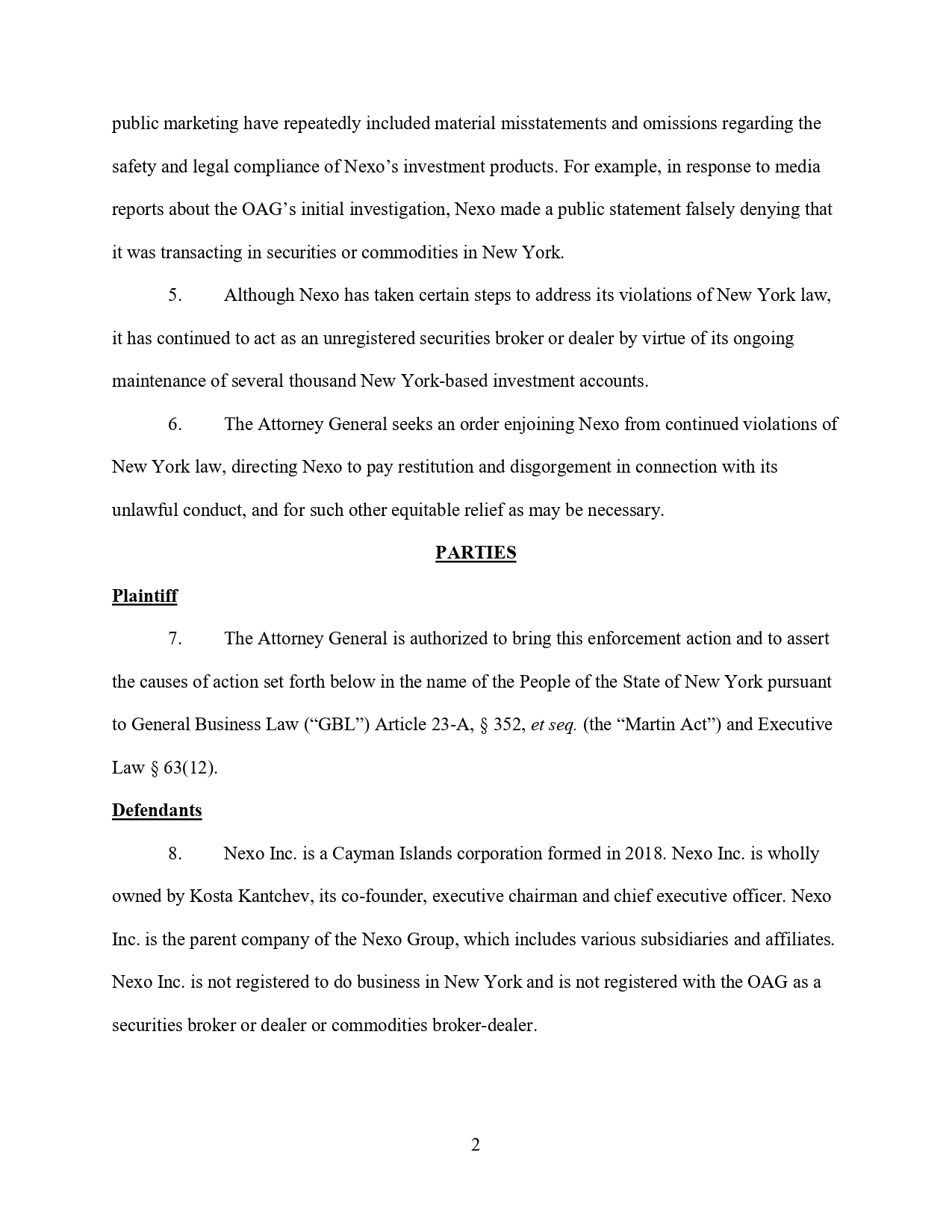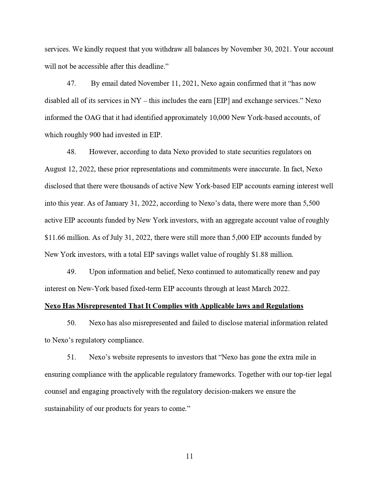 Уебсайтът на Nexo и други публикации многократно са съдържали съществени неточности и пропуски по отношение на безопасността и законосъобразността на инвестиционните продукти на Nexo, гласи жалбата. Например, в отговор на медийни съобщения за първоначалното разследване на OAG, Nexo направили публично изявление, в което излъгали. След това продължили да действат като нерегистриран брокер или дилър на ценни книжа, тъй като са поддържали няколко хиляди инвестиционни сметки в Ню Йорк.