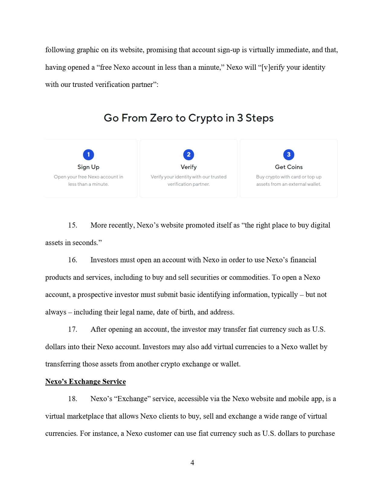 Освен това Nexo признава, че не е изисквала потребителите да бъдат „проверени“, нито е подлагала потребителските акаунти на своето „базирано на риска блокиране на IP адреси“, докато в акаунта на потребителя не е била депозирана минимална прагова сума. С други думи, Nexo не е правил нищо или почти нищо, за да потвърди самоличността или местоположението на потребителите, чиито депозити не са надвишавали минималния праг. Такива „непроверени“ клиенти можели да купуват и продават виртуални валути и да използват различни продукти и услуги на Nexo, без да предоставят никаква лична информация, освен имейл адрес, парола и контакт за двуфакторно удостоверяване.
