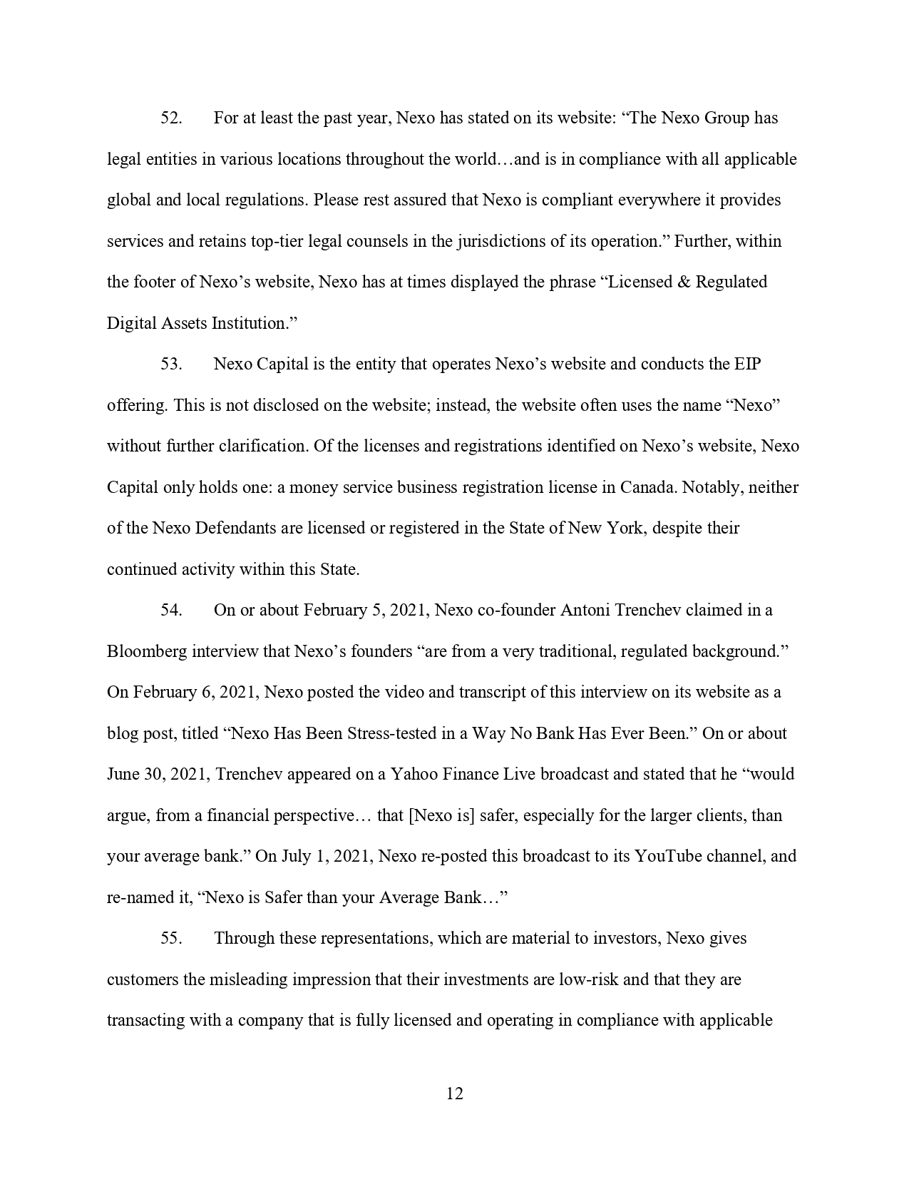 На 5 февруари 2021 г. или около тази дата съоснователят на Nexo Антони Тренчев твърди в интервю за Bloomberg, че основателите на Nexo „са от много традиционен, регулиран произход“. На 6 февруари 2021 г. Нексо публикува видеозаписа и стенограмата на това интервю на своя уебсайт като публикация в блог, озаглавена „Нексо е била подложена на стрес-тест по начин, по който никоя банка не е била“. На 30 юни 2021 г. или около тази дата Тренчев се появява в предаване на Yahoo Finance Live и заявява, че „от финансова гледна точка би твърдял, че [Nexo] е по-сигурна, особено за по-големите клиенти, от средната банка“. На 1 юли 2021 г. Nexo публикува отново това предаване в своя канал в YouTube и го преименува на „Nexo е по-безопасно от средната банка...“.