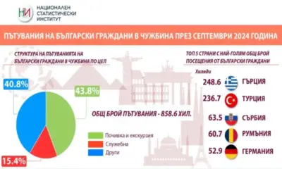 През третото тримесечие на 2024 г. 1.8 млн. български граждани са реализирали туристически пътувания . Преобладаващата част от тях - 72.3%, са пътували само в страната, 20.8% - само в чужбина, а 6.9% са пътували както в страната, така и в чужбина. В сравнение със същото тримесечие на 2023 г. броят на пътувалите лица на възраст 15 и повече навършени години запазва нивото си, съобщиха от НСИ.