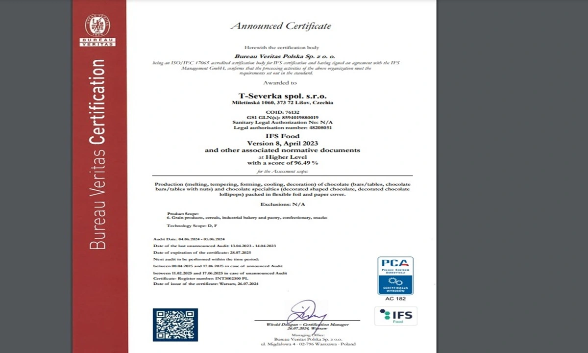 3. IFS сертификат (International Featured Standards) - Този международен стандарт е сред най-престижните сертификати за управление на качеството и безопасността на храните. Той удостоверява, че нашите продукти и производствени процеси отговарят на най-високите изисквания за безопасност, контрол на риска и устойчивост.