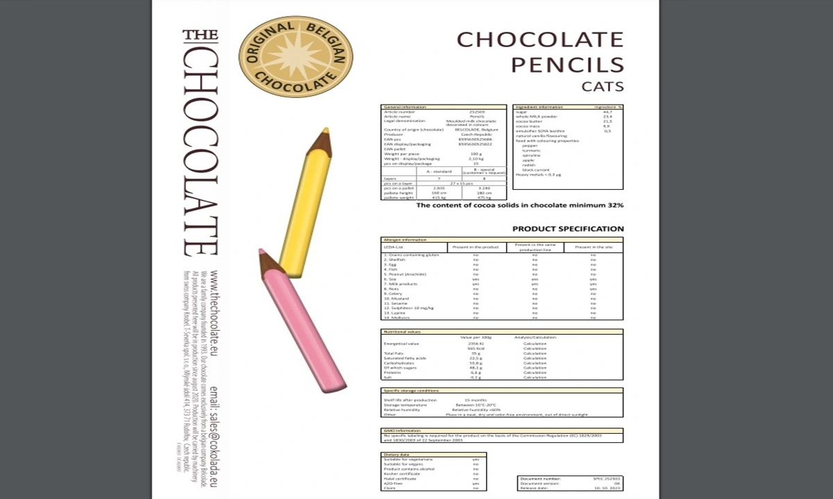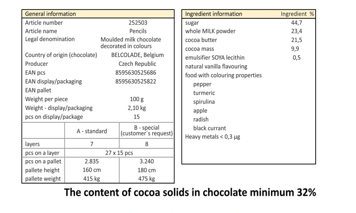 Шоколадовите продукти, включително тези с форма на моливи, отговарят на строгите изисквания на Европейския съюз и БАБХ за безопасност и качество на хранителните продукти. Всички те са произведени в съответствие с нормативните стандарти, а качеството им е потвърдено от редовни проверки на ниво Европейски съюз и национални органи.