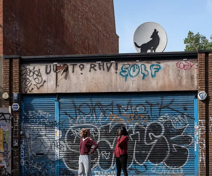 The latest piece is a stencil of a wolf howling towards the sky, painted on what appears to be a satellite dish on… pic.twitter.com/2x6XgZ9dpr