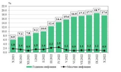 Данните на Евростат за октомври показват, че в 4 страни членки годишната инфлация през октомври надхвърля 20%. На първо място е Естония с 22,5%, следвана от Литва с 22,1%, Унгария с 21,9% и Латвия с 21,7%.