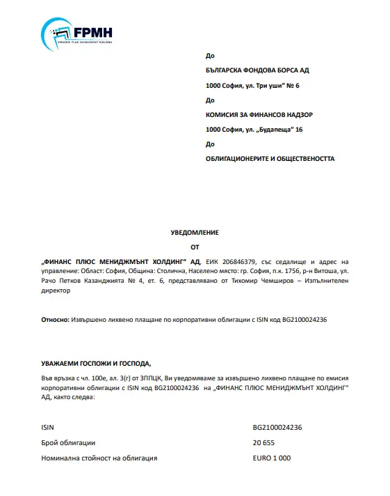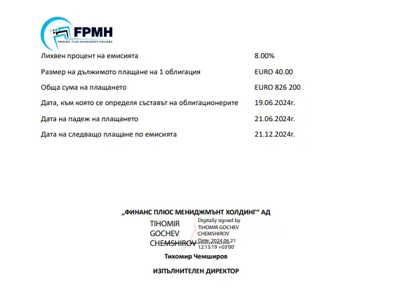 „ФИНАНС ПЛЮС МЕНИДЖМЪНТ ХОЛДИНГ“ АД, извърши лихвено плащане по корпоративни облигации с ISIN код BG2100024236, като сумата на платените лихви към притежателите е 826 200 евро.