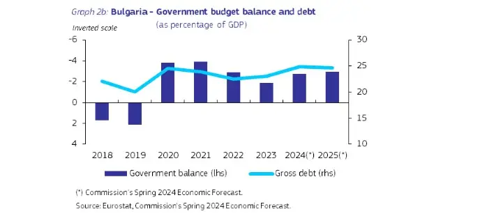 България не е предмет на решение на Съвета относно наличието на прекомерен дефицит. Дефицитът по консолидирания държавен бюджет намаля с 1,1 процентни пункта до 2,9% от БВП през 2022 г. и се сви още повече до 1,9% от БВП през 2023 г.