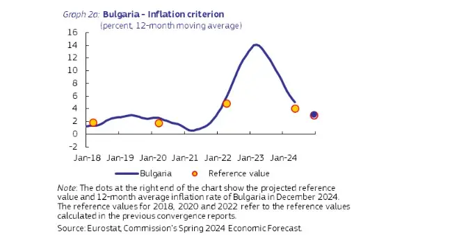 Средният темп на инфлация в България през 12-те месеца до май 2024 г. е 5,1%, което е над референтната стойност от 4,1%. Комисията прогнозира, че през следващите месеци той ще остане малко над референтната стойност, но се очаква разликата да се заличи до края на 2024 г. или в началото на 2025 г.