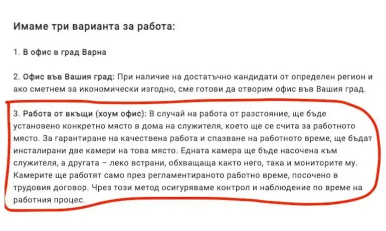 Варненска фирма от сферата на високите технологии и уеб дизайна е на път да грабне приза „Обява за работа на годината“ с офертата си да сложи две камери по цял ден да снимат техния бъдещ служител и обещанието вечер да ги изключват. Снимка на предложението беше споделена във Фейсбук групата DevBG-Jobs и за денонощие събра хиляди реакции, коментари и споделяния.