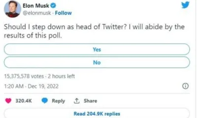 Туитър В анкетата, пусната от него, 57% от вота – 10 млн. гласували, заявяват, че искат той да се оттегли от ръководния пост в компанията, купена от него за 44 млрд. долара.