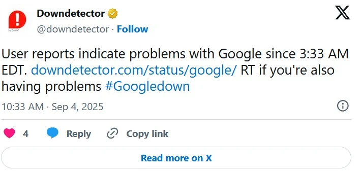 Сайтът Downdetector.com също съобщава за текущата ситуация с продуктите на американската компания Alphabet.