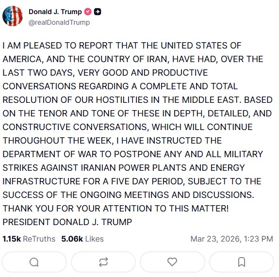 „Наредих на Министерството на отбраната да отложи всякакви военни удари срещу ирански електроцентрали и енергийна инфраструктура за период от пет дни, в зависимост от успеха на продължаващите срещи и дискусии“, написа още президентът на САЩ.
